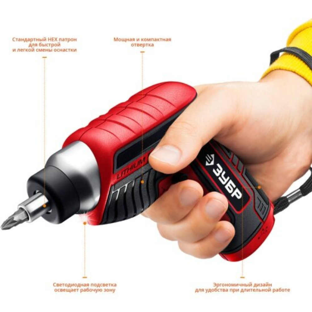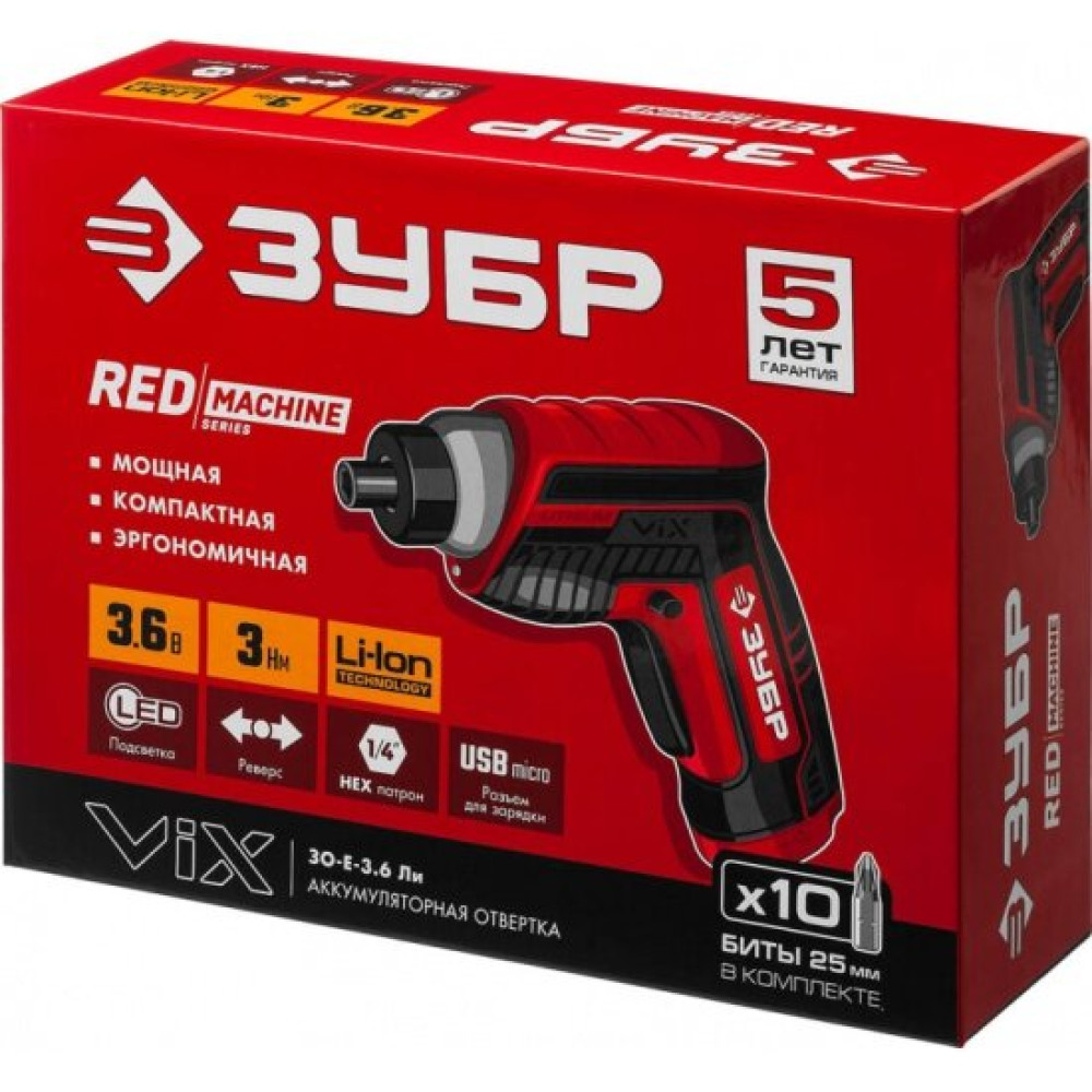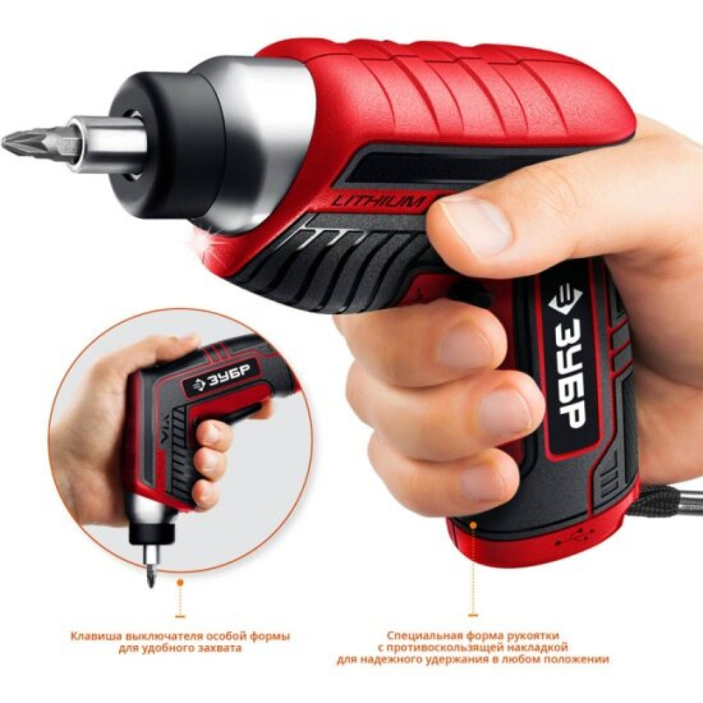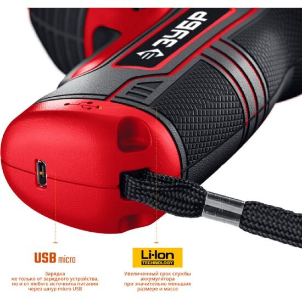 Аккумуляторная отвертка Зубр ЗО-Е-3.6 Ли снабжается АКБ с низким саморазрядом и отсутствием эффекта памяти, которая характеризуется выходным напряжением 3.6 В. Зарядка интегрированной батареи от сетевого адаптера, включенного в комплект, производится по кабелю через разъем MicroUSB. При весе всего 0.35 кг инструмент имеет подсветку рабочей зоны для повышения точности работ и предлагается вам вместе с зарядным устройством, набором бит.